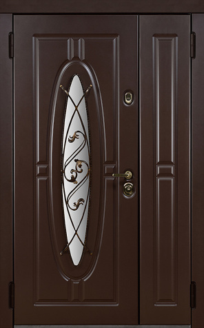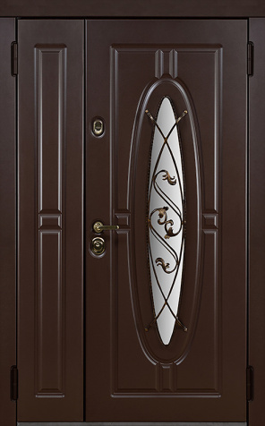 Двойная уличная дверь с овальным стеклом и художественной ковкой №14