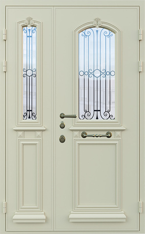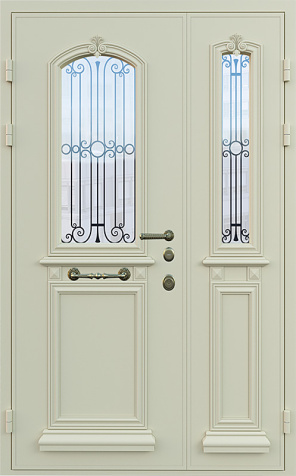 Двухстворчатая парадная дверь с ковкой и стеклом белая №30