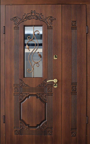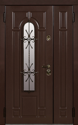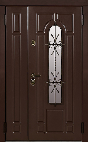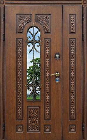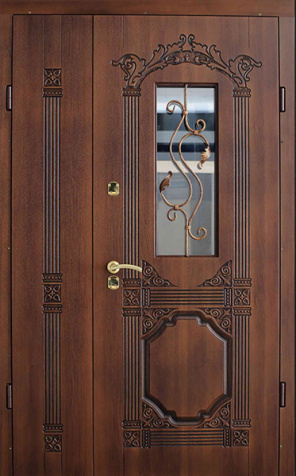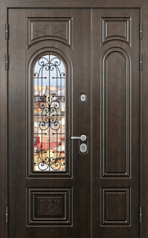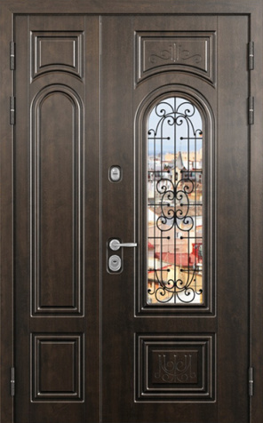 Двойная входная дверь с большим стеклом и ковкой для дома №25