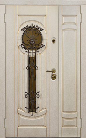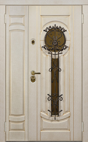 Парадная полуторная дверь с ковкой и золотой фурнитурой №17