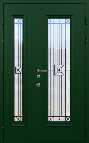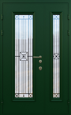 Уличная двухстворчатая дверь со стеклом и кованой решеткой №26